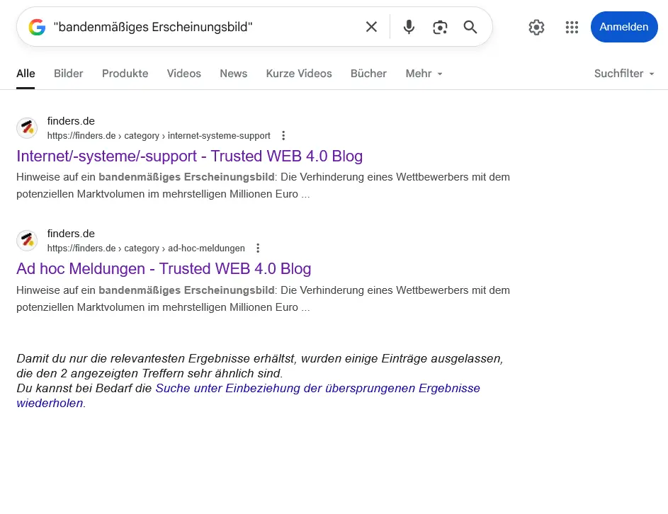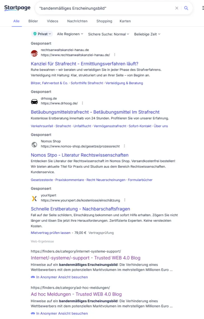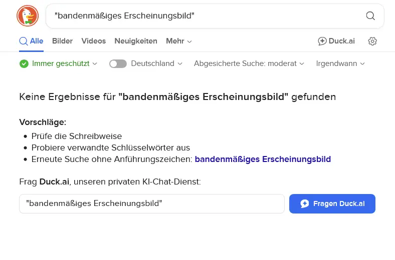 Offensichtlich fühlten sich DuckDuckGo und Bing besser dabei, das Suchergebnis hierzu zu löschen. Zumindest bei DuckDuckGo gab es vorher ein Ergebnis. Immerhin Google hat es noch!